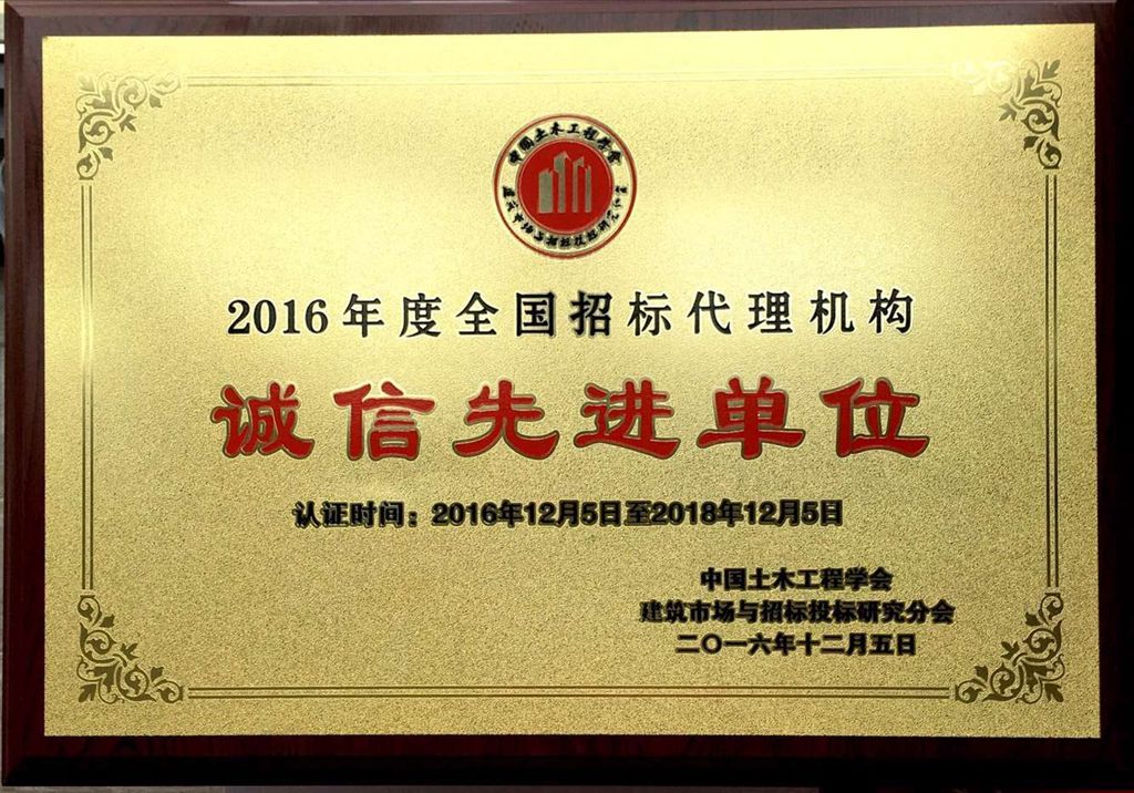 獲得2016年度全國招標(biāo)代理機(jī)構(gòu)誠信先進(jìn)單位稱號